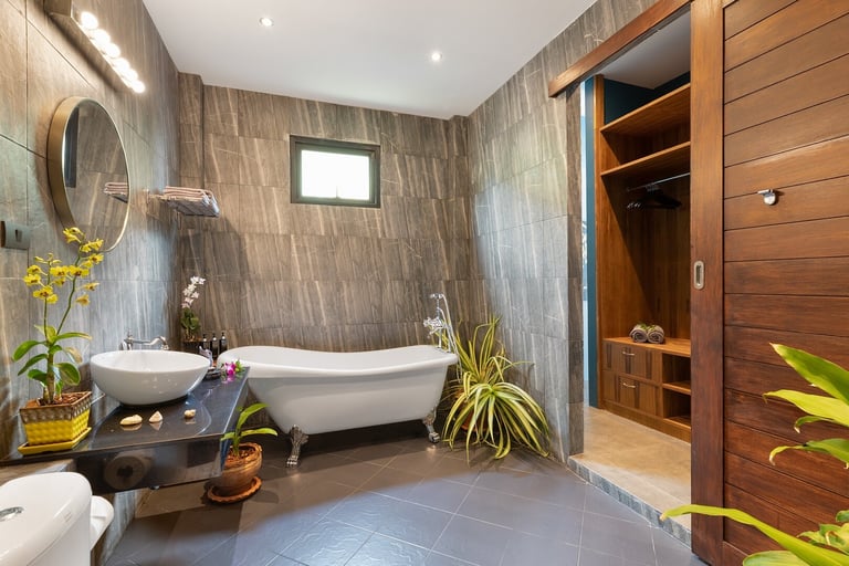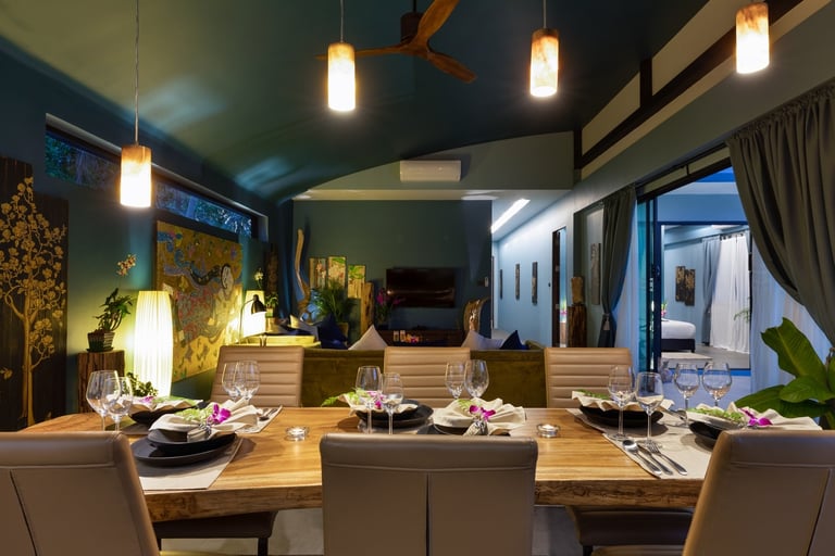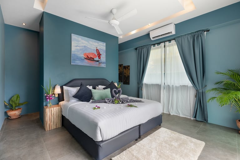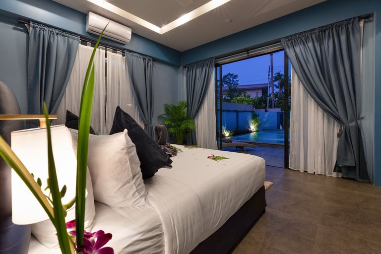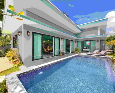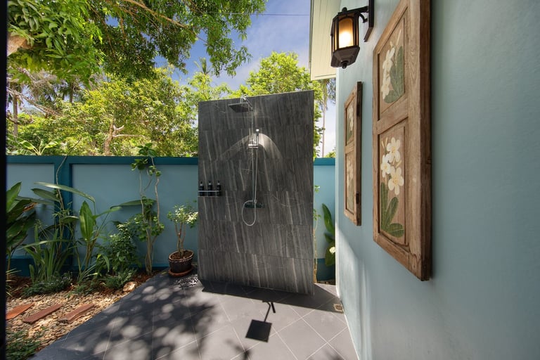 This new, modern pool villa spans 210 square meters. Named for our love of native Thai orchids, Villa "Baan Suaan Kluay Mai" is spacious yet cozy, ideal for couples, friends, families, or empty nesters. It includes all utilities, with breakfast and full catering available (subject to charge and staff availability). The villa is serviced every second day, with full bedding and towel changes every fourth day. Each ensuite bedroom features large bathrooms with baths and both indoor and outdoor showers. "Elle" spa brand toiletries and sanitizing hand cleaners are provided.