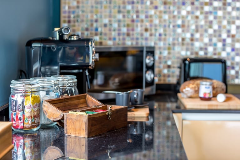 The modern, fully equipped kitchen includes an espresso machine, a fridge stocked with essentials, a wine fridge with reasonably priced wines, complimentary teas, ground and instant coffee, unlimited water, and a large selection of fruit, including fresh oranges and lemons for juicing.